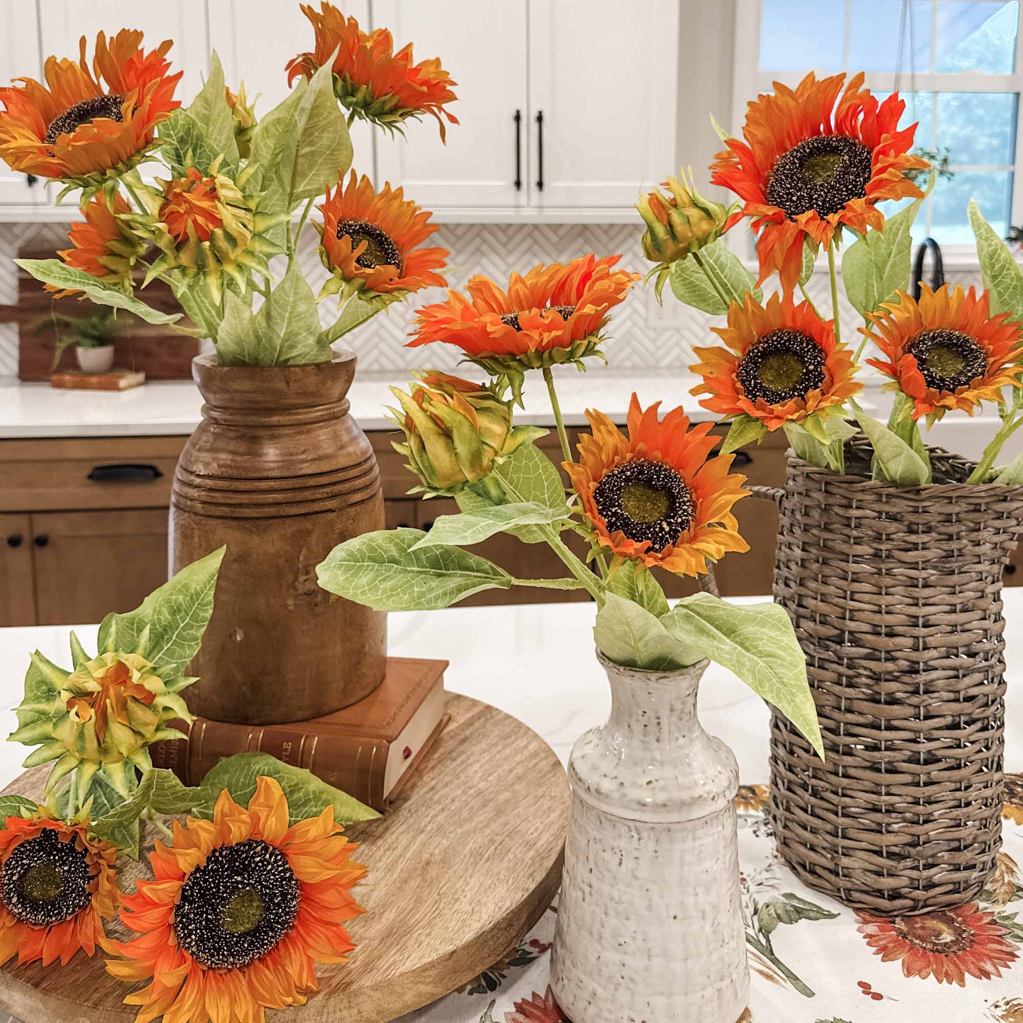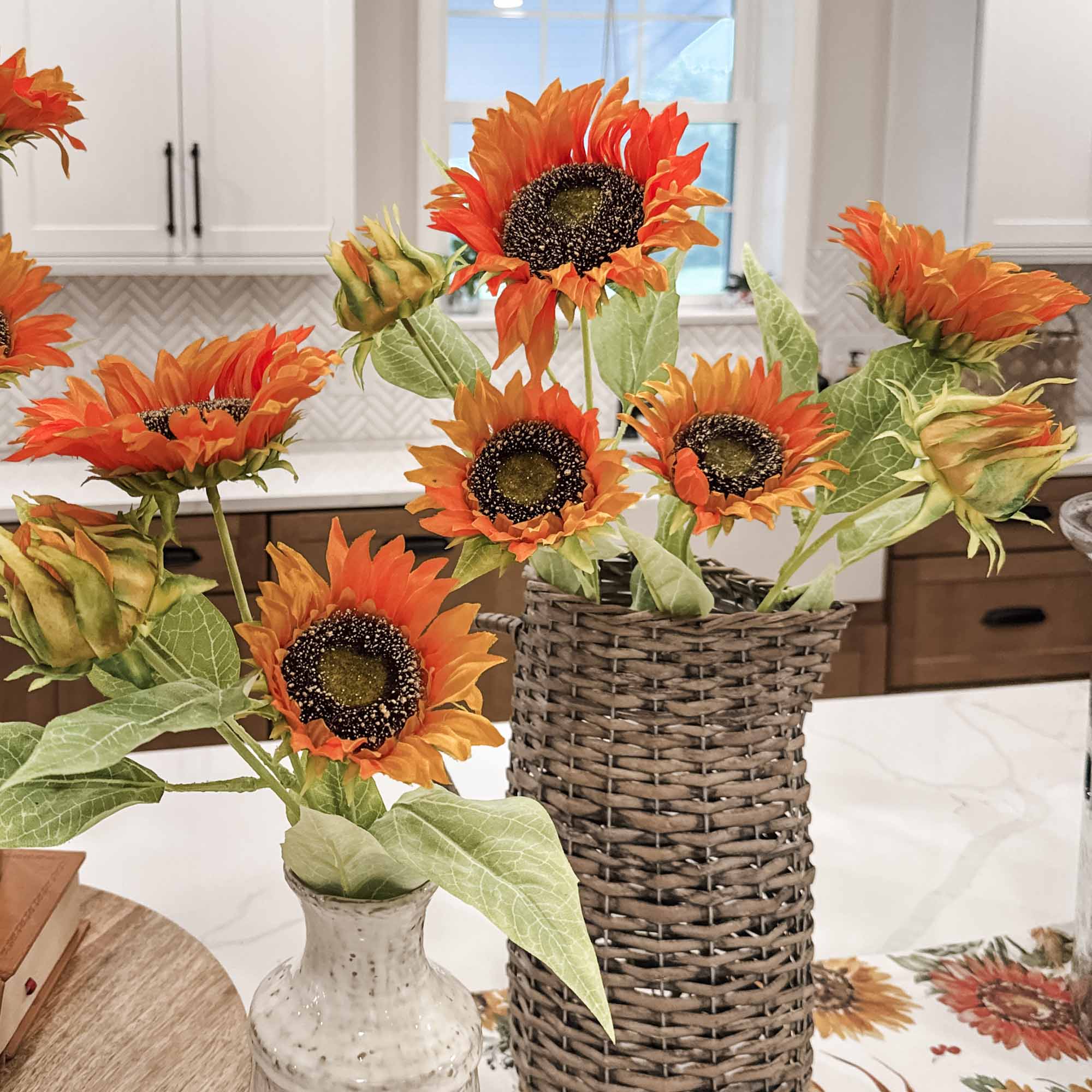 Whether displayed on their own or mixed with autumn foliage, these stems evoke the rustic beauty of a fall sunflower field—ideal for Thanksgiving gatherings, farmhouse-inspired interiors, or simply adding a pop of color to your everyday space. Celebrate the beauty of the harvest season with these radiant sunflowers that bring joy and color to every corner of your home.