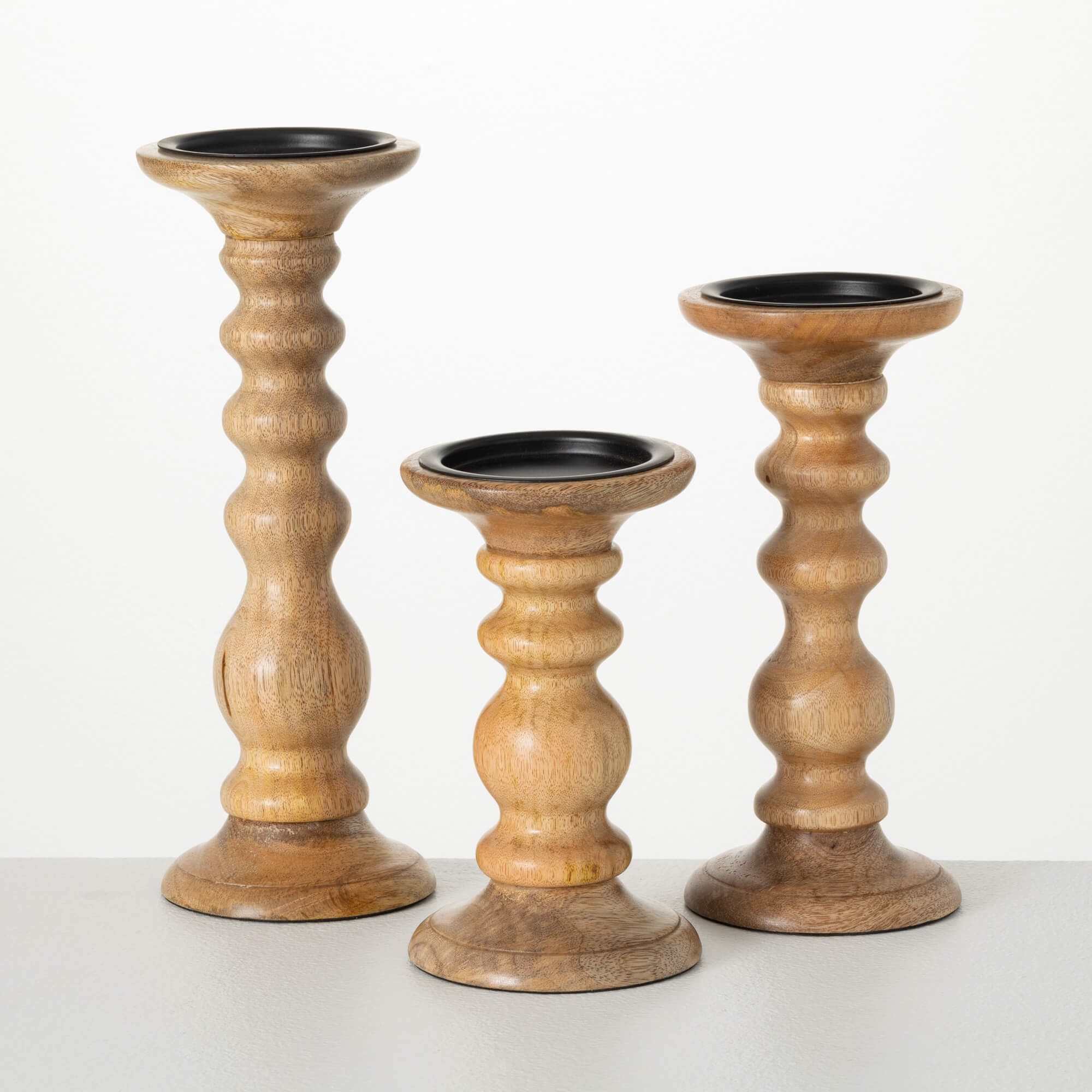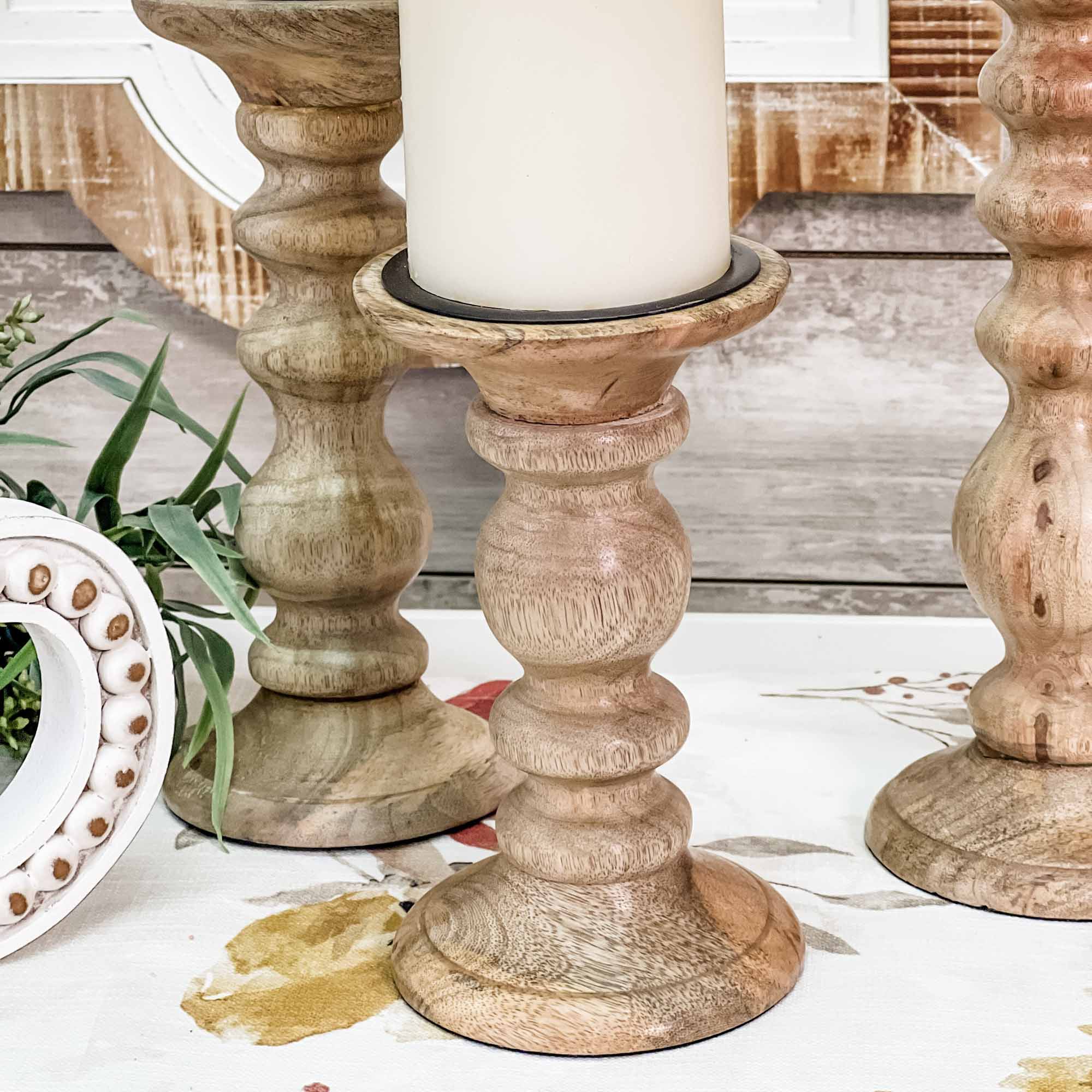 Bring rich, natural wood to your home with these Candle Pedestal Holders, guaranteed to warm up your interiors immediately. Perfect for displaying pillar candles and decorative candle rings, these accents can just as easily elevate other floral accents, half-spheres, orbs or other treasured items. The turned wood displays classic pillar design that highlights what we love about traditional good looks. This trio of candlesticks is guaranteed to compliment to every home style. Curvy silhouettes, in three similar but slightly-different designs, feature gorgeous wood grain that brings an organic element that is everywhere right now. This trio helps you create a warm and welcoming display in your entryway, on a sideboard or buffet. The options for display are limited only by your imagination. Foam on base, protects surfaces. Set/3.