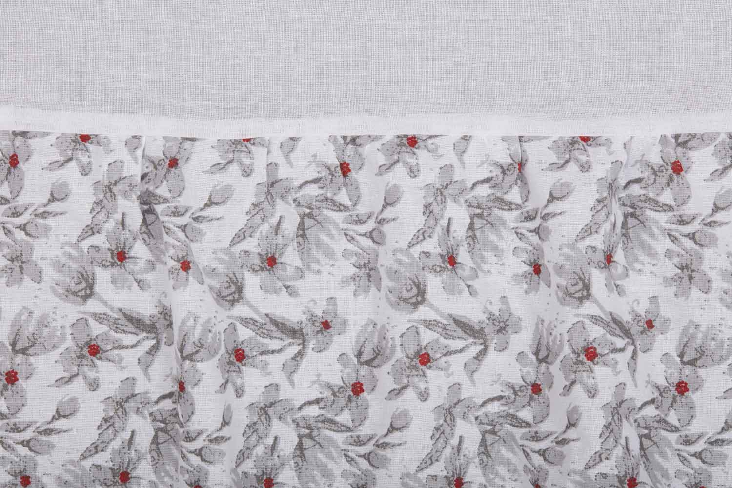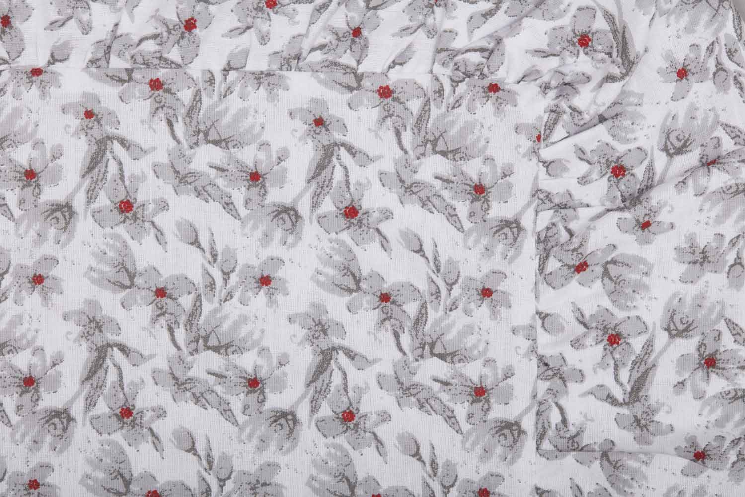 The Twilight Floral Collection features a playful, repeating pattern of flowers and leaves in dusty gray with shades of charcoal on a fresh white background. The design is accented with small red pops of color that bring visual interest and energy to the understated, neutral color scheme. Gently-gathered ruffles add softness and flounce to your bedding ensemble as they cascade toward the floor. The floral design and gathered fabric adds a luxurious layer and the gracefully scalloped edge finishes the look with a decidedly feminine flair. The fabric is a lightweight, breathable cotton that offers delightful charm with a playful touch to your farmhouse bedroom.