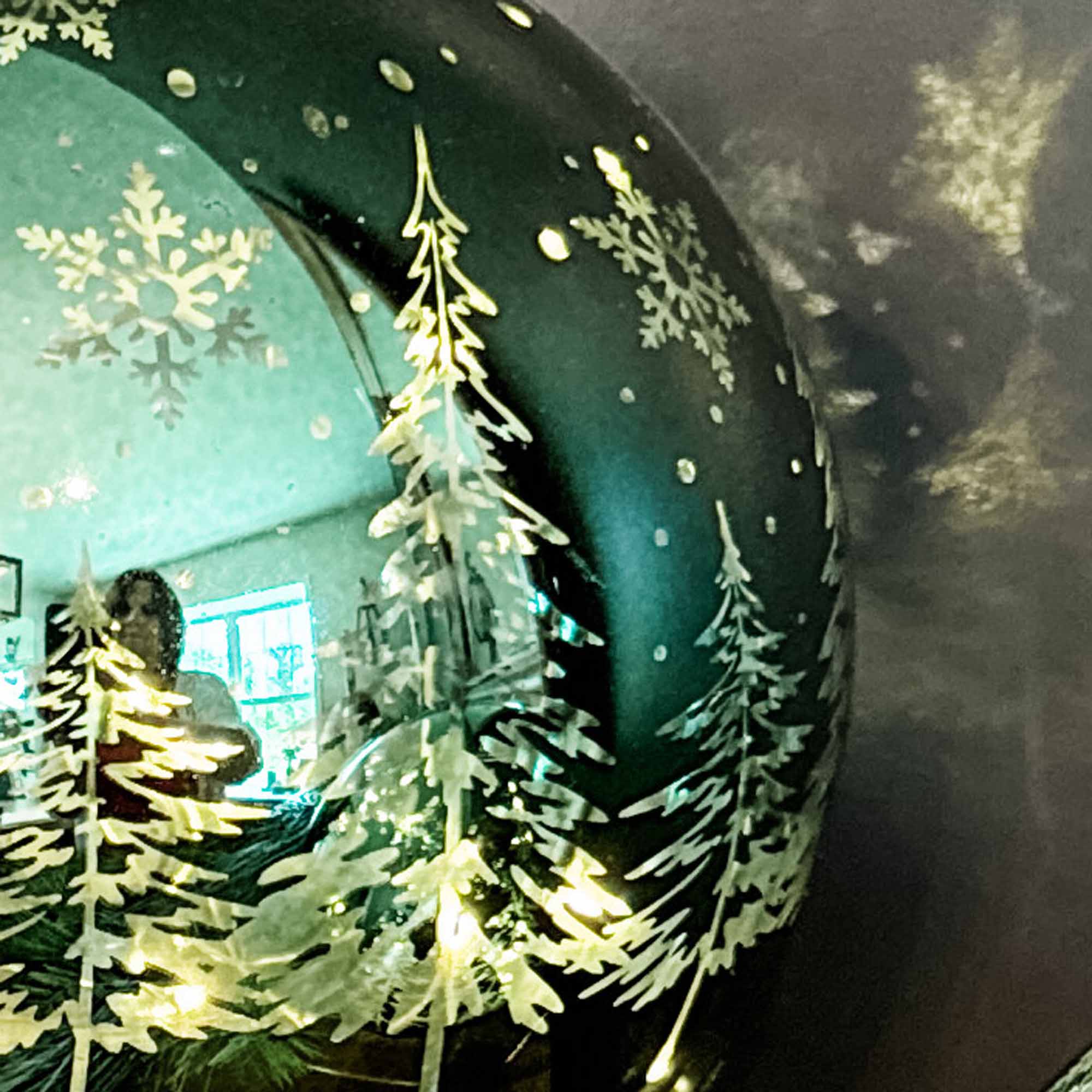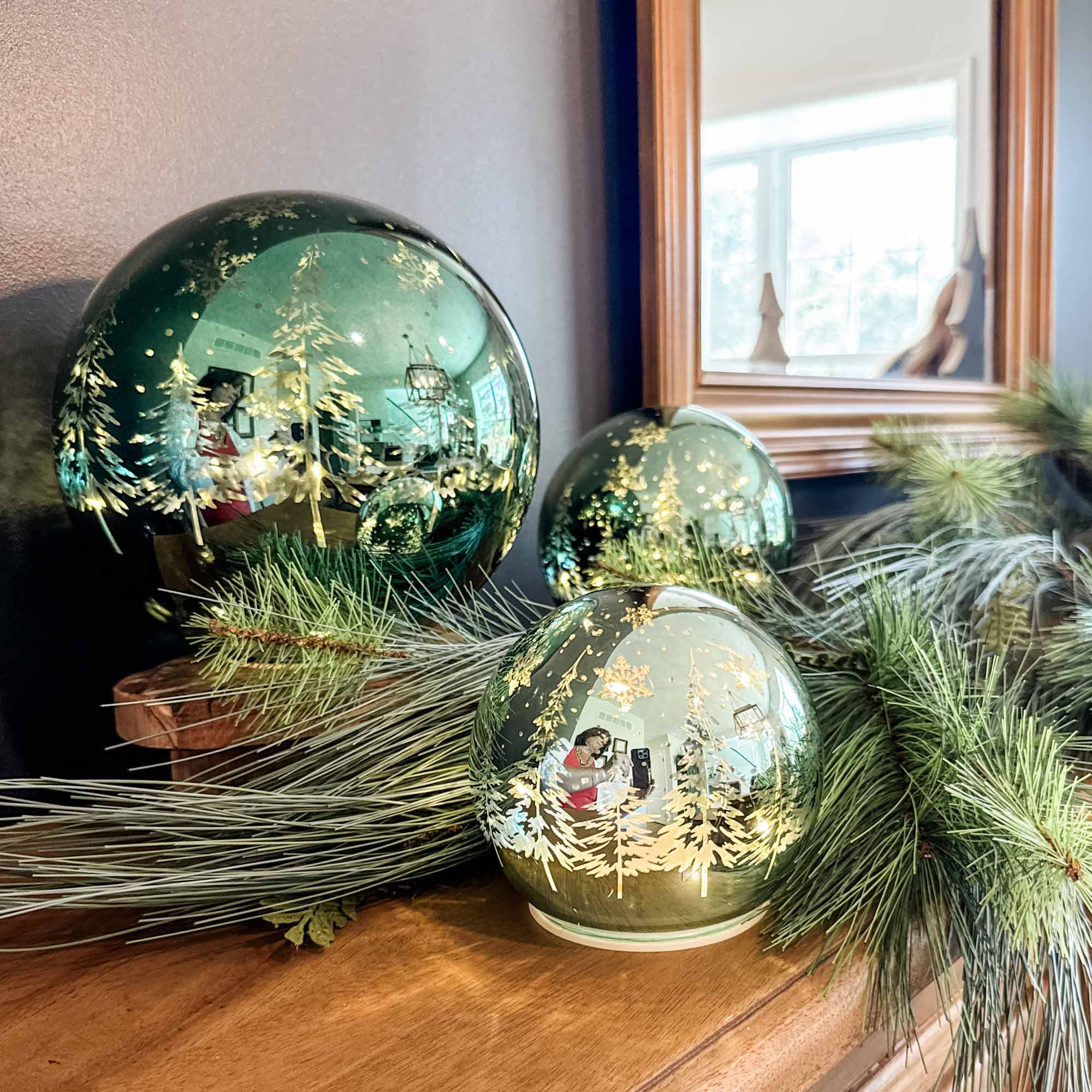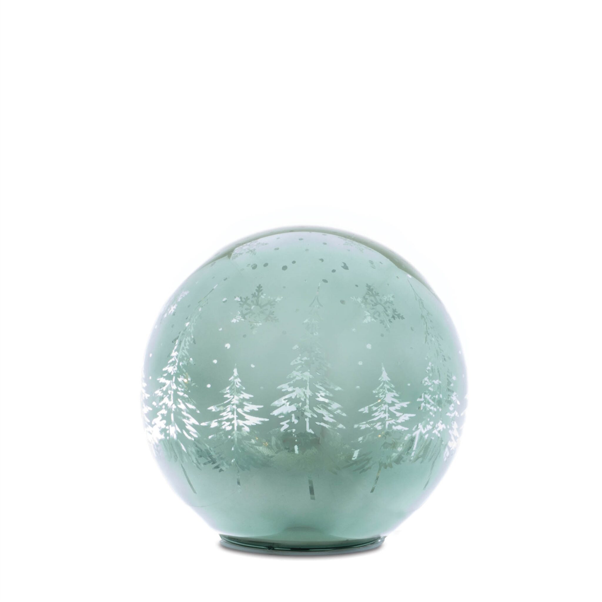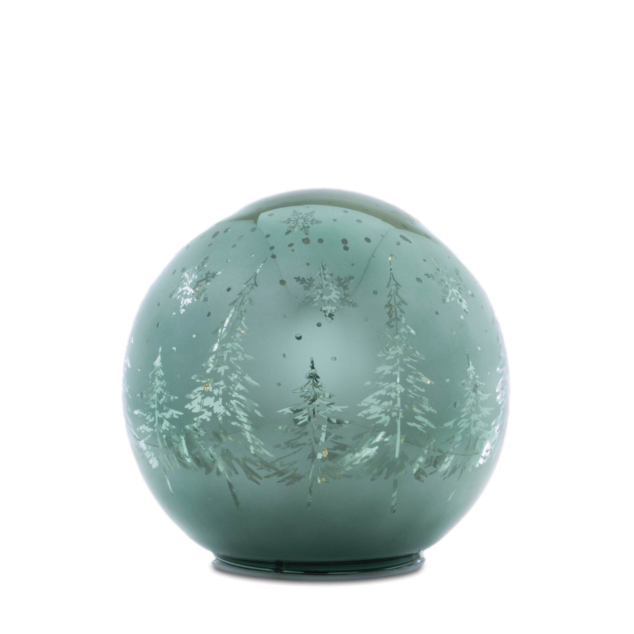 Capture the peaceful beauty of a quiet winter forest with the Twilight Trees LED Globe Set. This trio of elegant glass globes features a delicate pine tree silhouette in soft, wintry shades of green and blue, creating a serene, nature-inspired scene. Each globe glows from within with warm white LED lighting, adding a cozy and inviting touch to mantels, shelves, and holiday tablescapes.