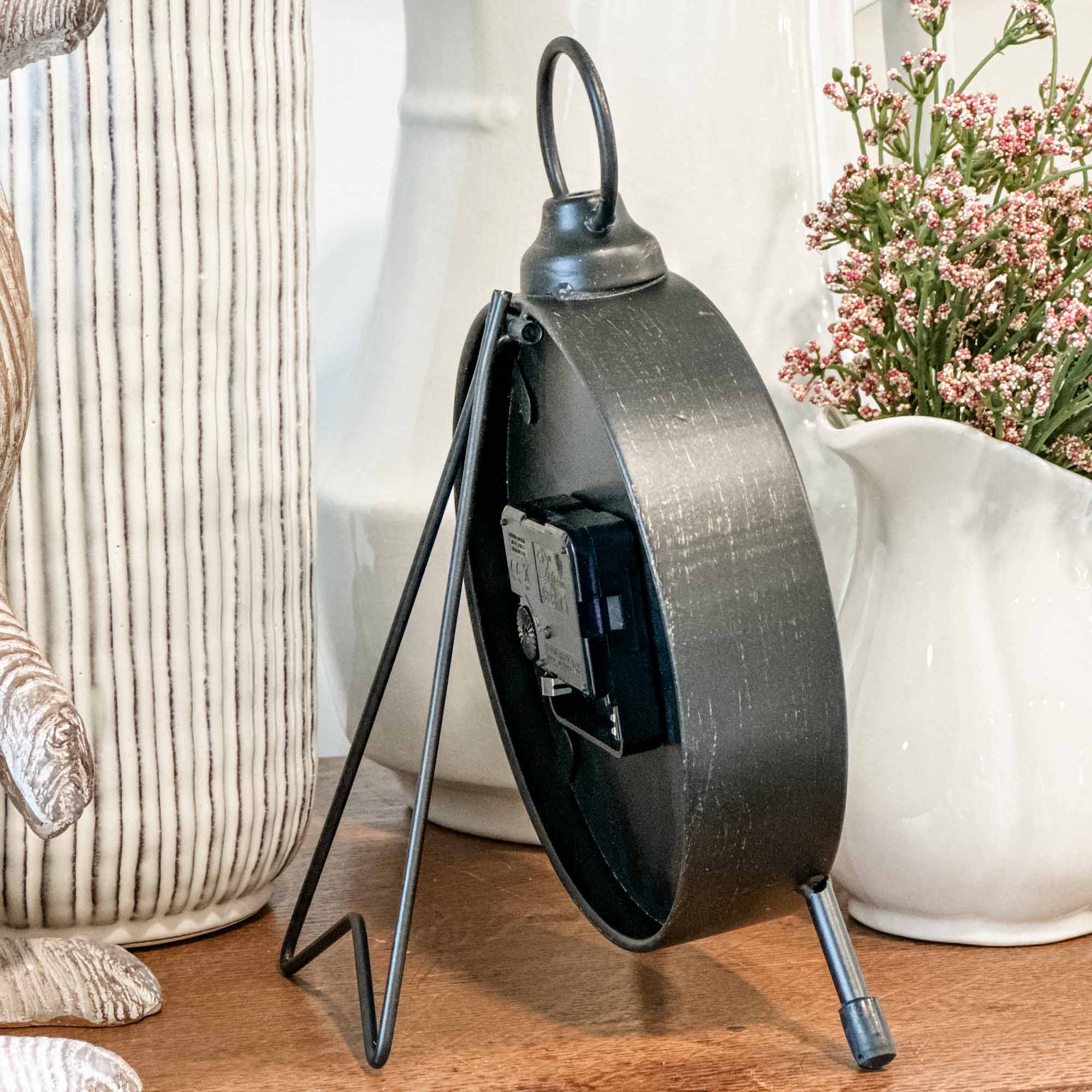 Transport yourself to a bygone era with our exclusive Sullivans black metal desk clock, a charming addition to any space. With its pocket watch-inspired design, complete with a top fob and rubbed black metal finish boasting subtle gold undertones, this timepiece exudes vintage appeal. The white face adorned with modern numbers ensures easy readability, while the sturdy easel extends for optimal display. Perfect for desks or mantels, this clock adds a touch of nostalgia while helping you stay punctual.