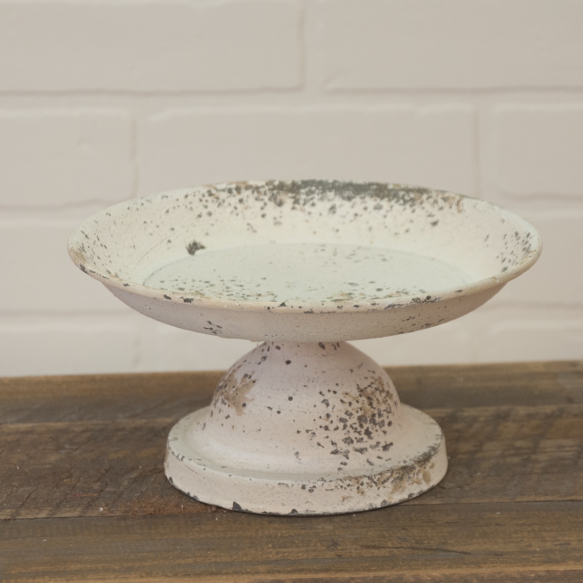 The Vintage White Pedestal offers a delightful accent that will aid you in your designs and displays through the seasons. Perfectly-proportioned with the graceful details and the classic silhouette of a stemmed compote dish, this decorative element will come in handy in numerous ways, in multiple settings. Display with a pillar candle and seasonal candle ring, or create a terrarium and cover with a glass dome. The weathered neutral tones and classic good looks ensure that you’ll be able to use the Vintage White Pedestal in vignettes for years to come. Candle & greens sold separately.