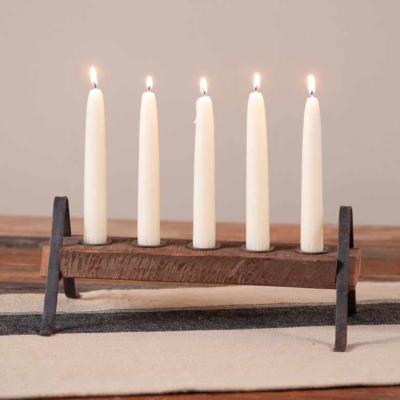 Create a striking display with our Vintage Wood Block Five-Candle Holder with Iron Legs. Handcrafted from reclaimed wood, each piece showcases its own unique grain, texture, and weathered character, making every candle holder one of a kind. The solid iron legs elevate the wooden block for added presence, blending rustic warmth with an industrial edge.