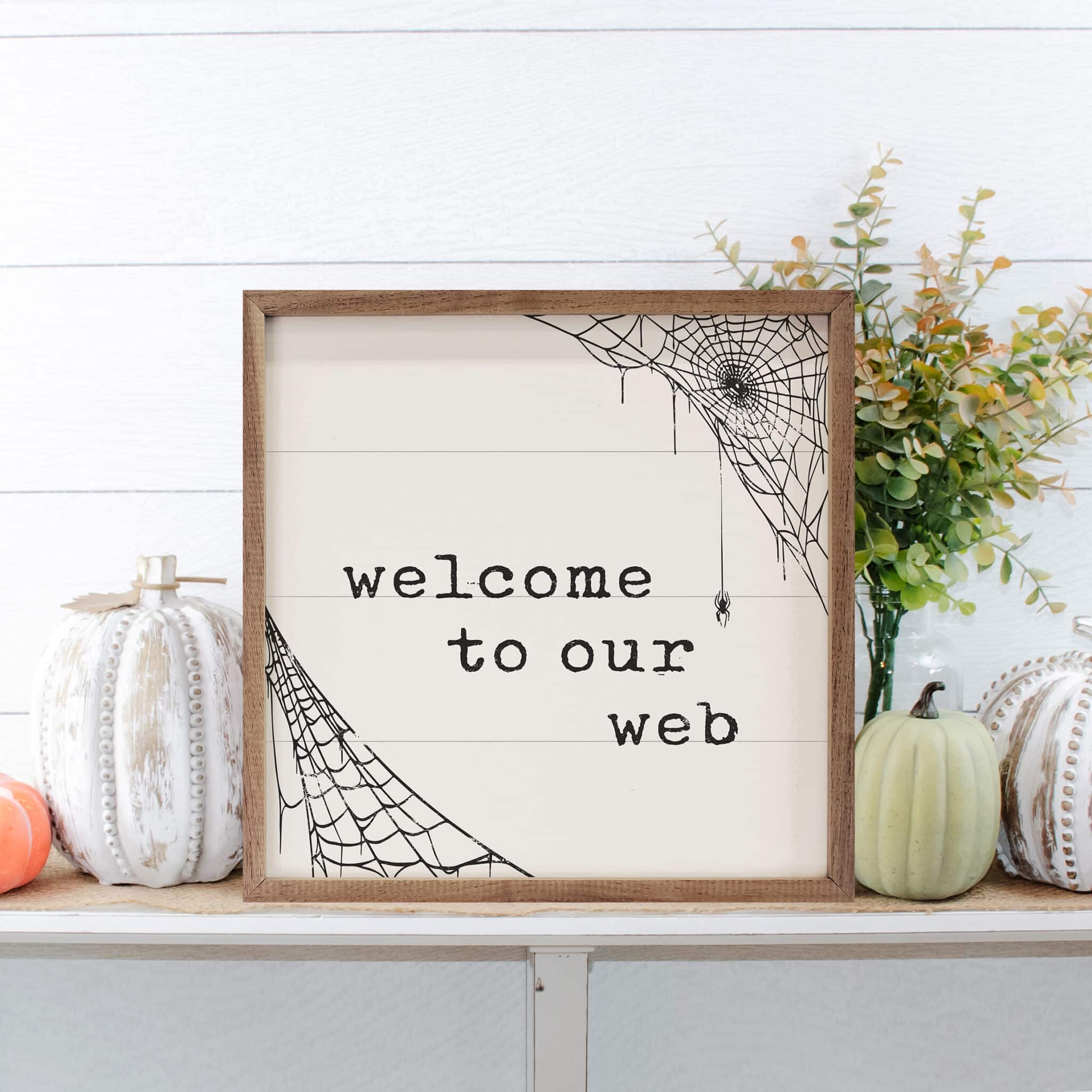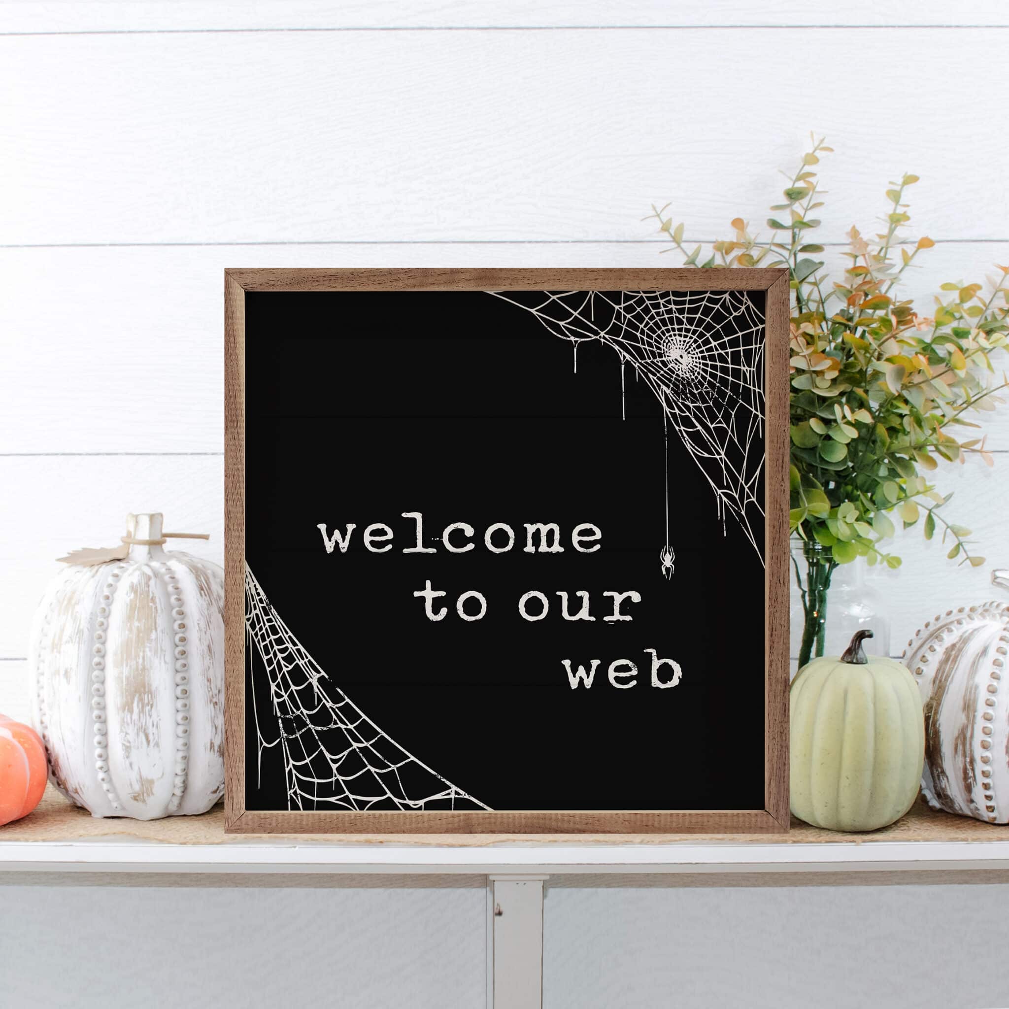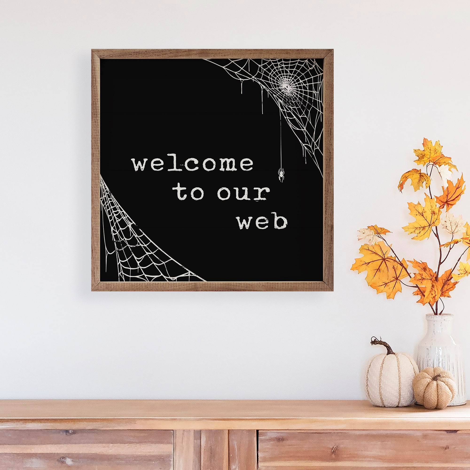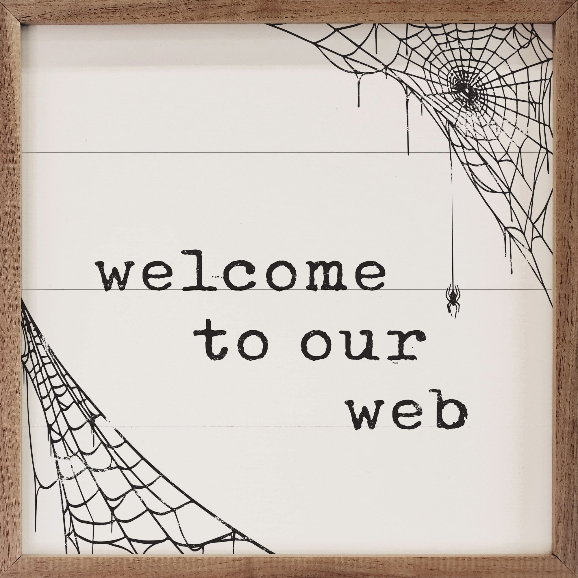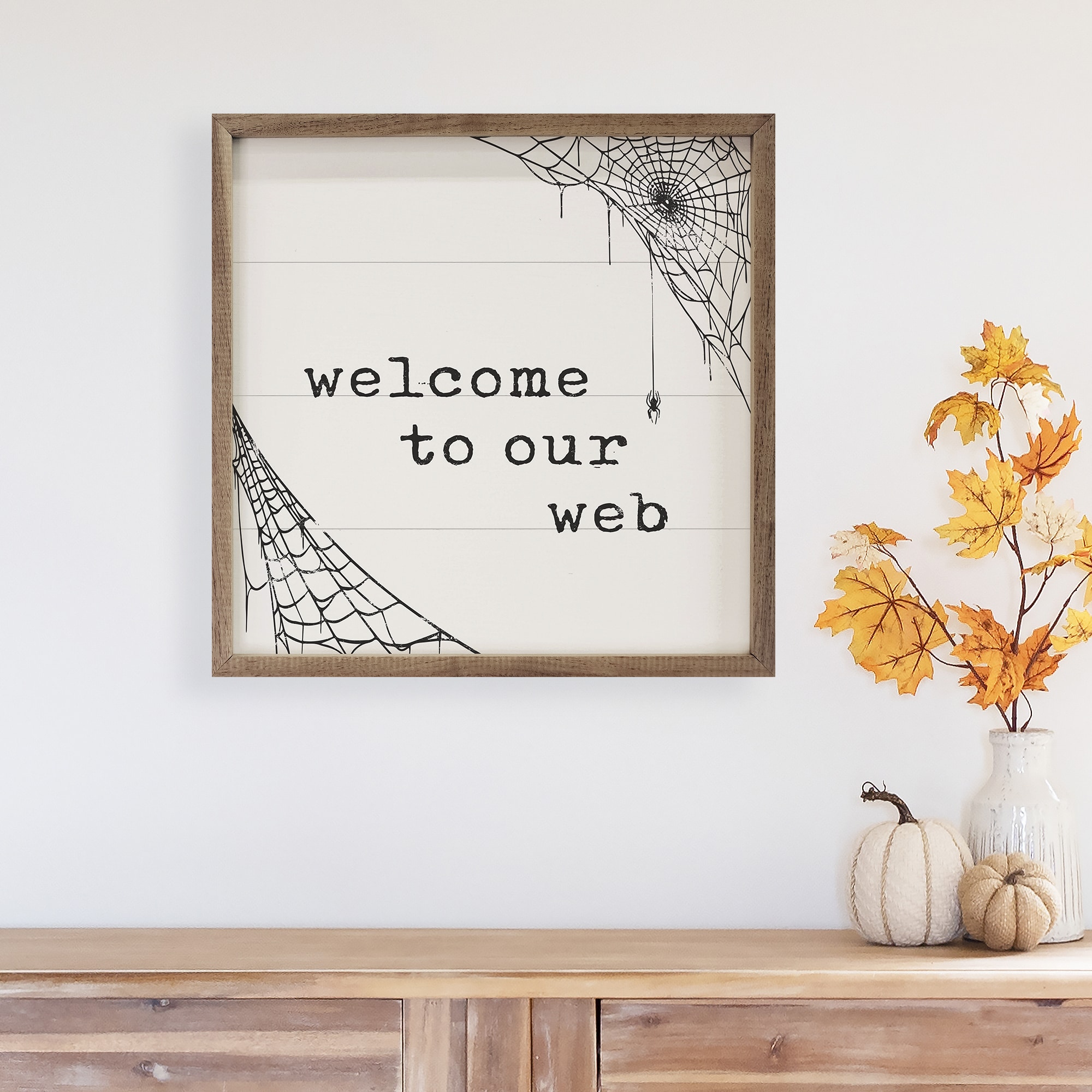 Add a touch of spooky fun to your Halloween decor with the Welcome to Our Web Wooden Sign. Featuring bold lettering surrounded by intricate spiderweb designs, this seasonal accent strikes the perfect balance of eerie charm and playful style. Choose from two versatile looks to suit your space: a black background with white lettering and webs for a bold, dramatic effect, or a whitewashed background with black accents for a softer farmhouse feel. Finished with a natural wood frame, this sign makes a festive statement whether hung on your wall, placed in an entryway, or styled on a mantel. Signs are made to order.