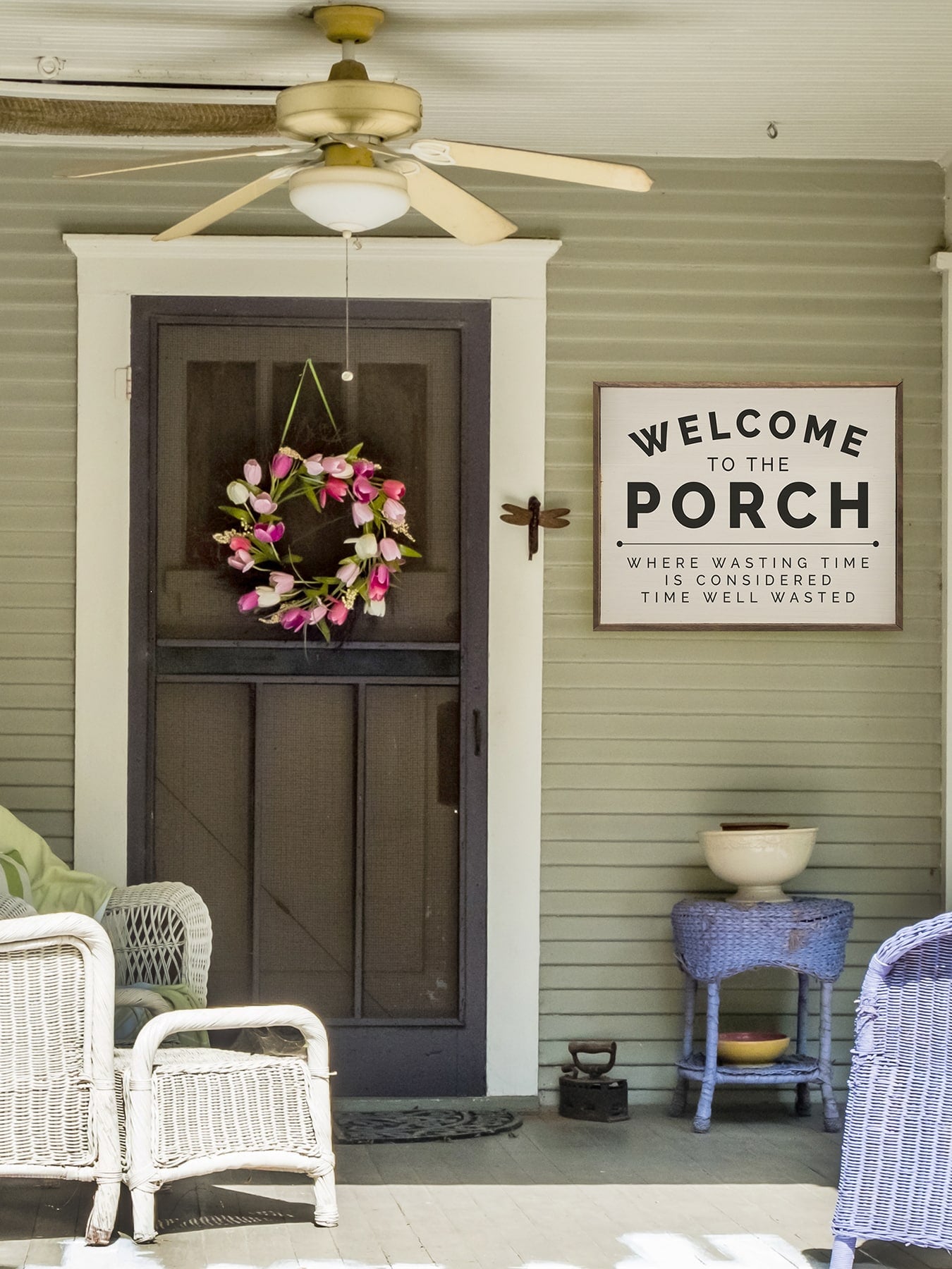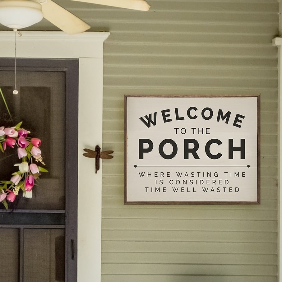 Welcome to the porch! This simply-styled wooden sign is the perfect addition to any porch, providing a warm and inviting touch to your outdoor space. Featuring understated neutral tones of creamy white background with crisp black lettering, this accent has a sleek, modern style that hits the perfect note for your farmhouse, right now. The sentiment captures what we love about a front porch… a place to gather, relax and watch the world go by. Whether you’re sipping lemonade, visiting with friends or neighbors, or simply taking in the sights and sounds of nature, time spent on the porch is truly time well “wasted”. With its understated style and interesting message, the porch sign adds a timeless touch to your home. The wooden frame brings a shadow box dimension, finishing the look with a warm, natural tone that adds charm and interest without overwhelming the words.