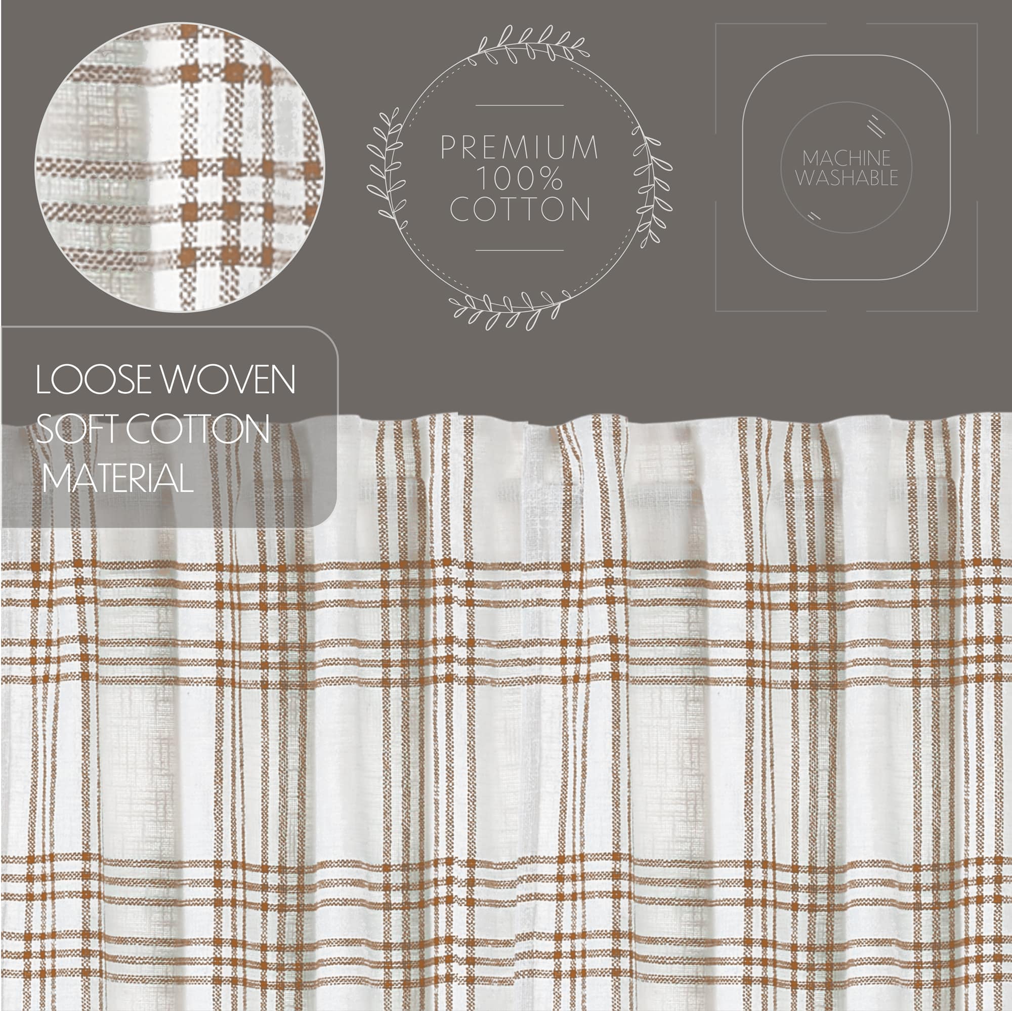 Create a country aesthetic of soft colors with our Wheat Plaid Valance. This curtain features hues of golden tan and soft white that blend in the straight-edged, textured woven weave for a classic country look. Rod pockets and back tabs are included near the top of this plaid valance for easy hanging.