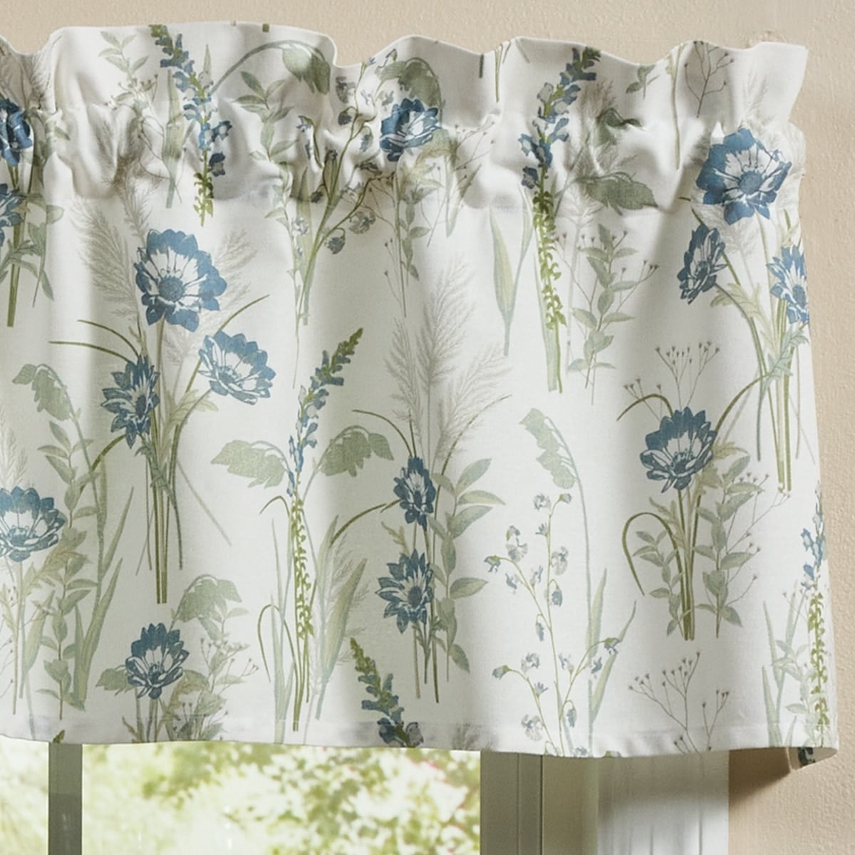 Bring the beauty of a serene garden into your home with the Whispering Grove Valance. Designed with delicate florals in soft shades of blue, green, and cream, this valance creates a soothing, nature-inspired backdrop that will brighten your window. The tranquil color palette, and graceful botanical design will effortlessly enhance your decor. Complete your design with table linens for a kitchen that’s dressed with fine design.