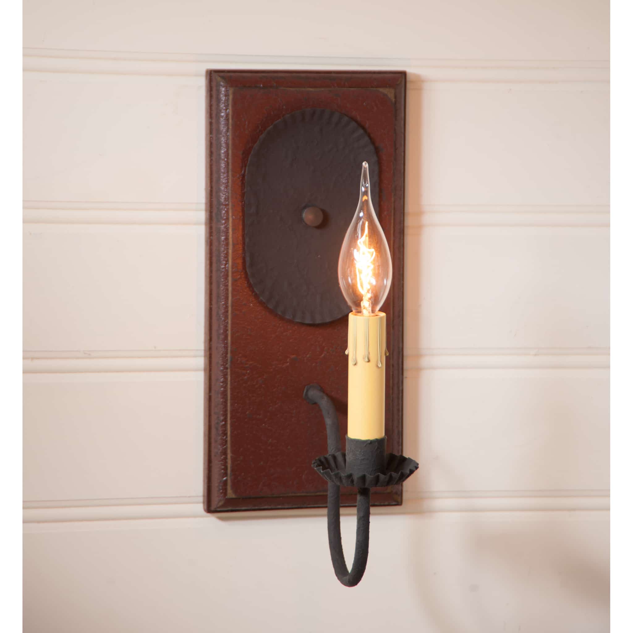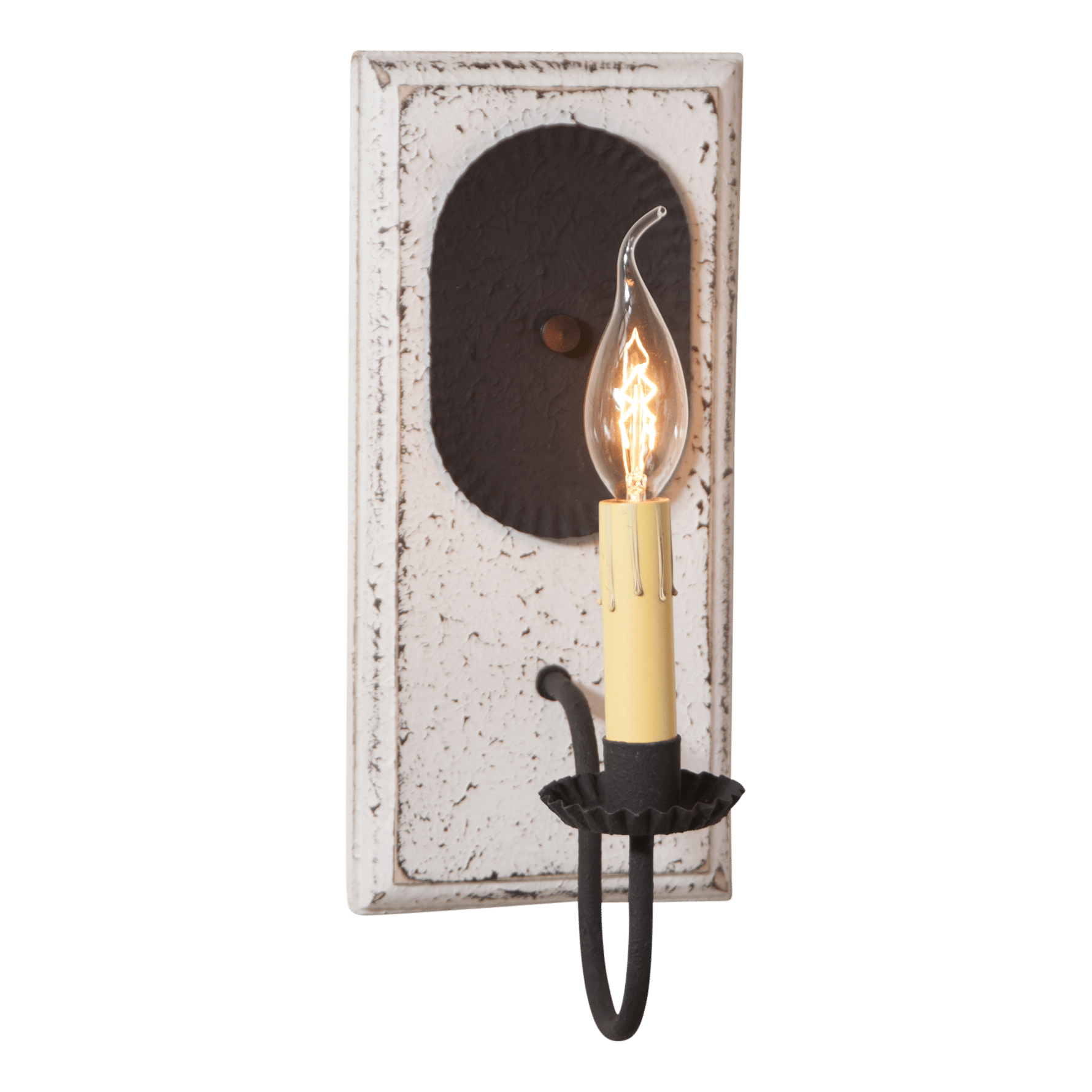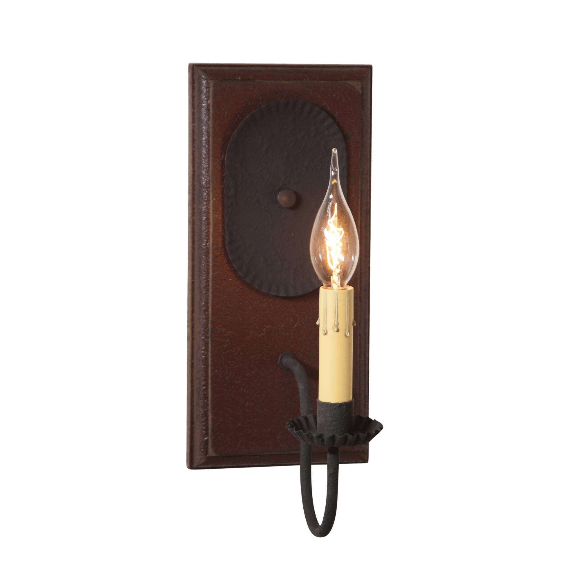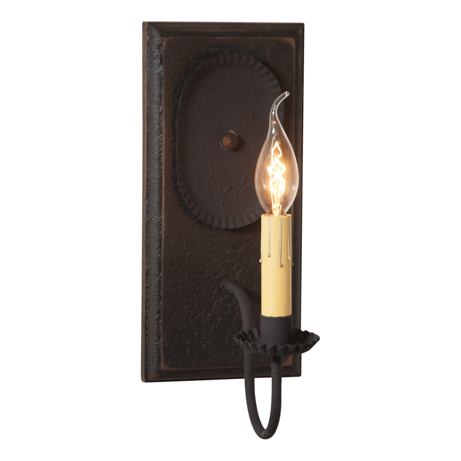 Direct wired with one candelabra socket, 60 watts max. per arm. Black textured arms with crimped pans. Handcrafted in Pennsylvania. This vanity light is UL-CUL listed and has a 5-year guarantee.