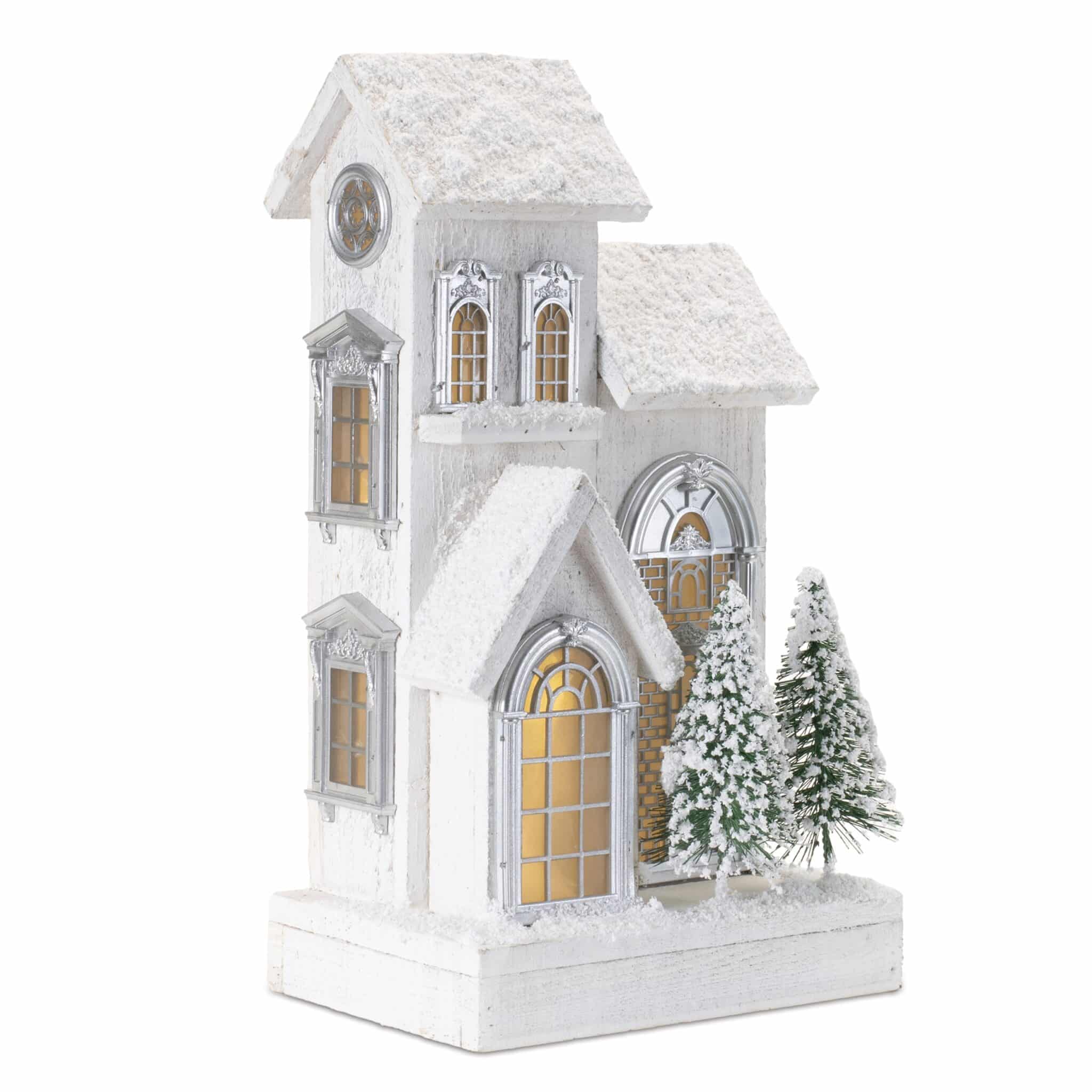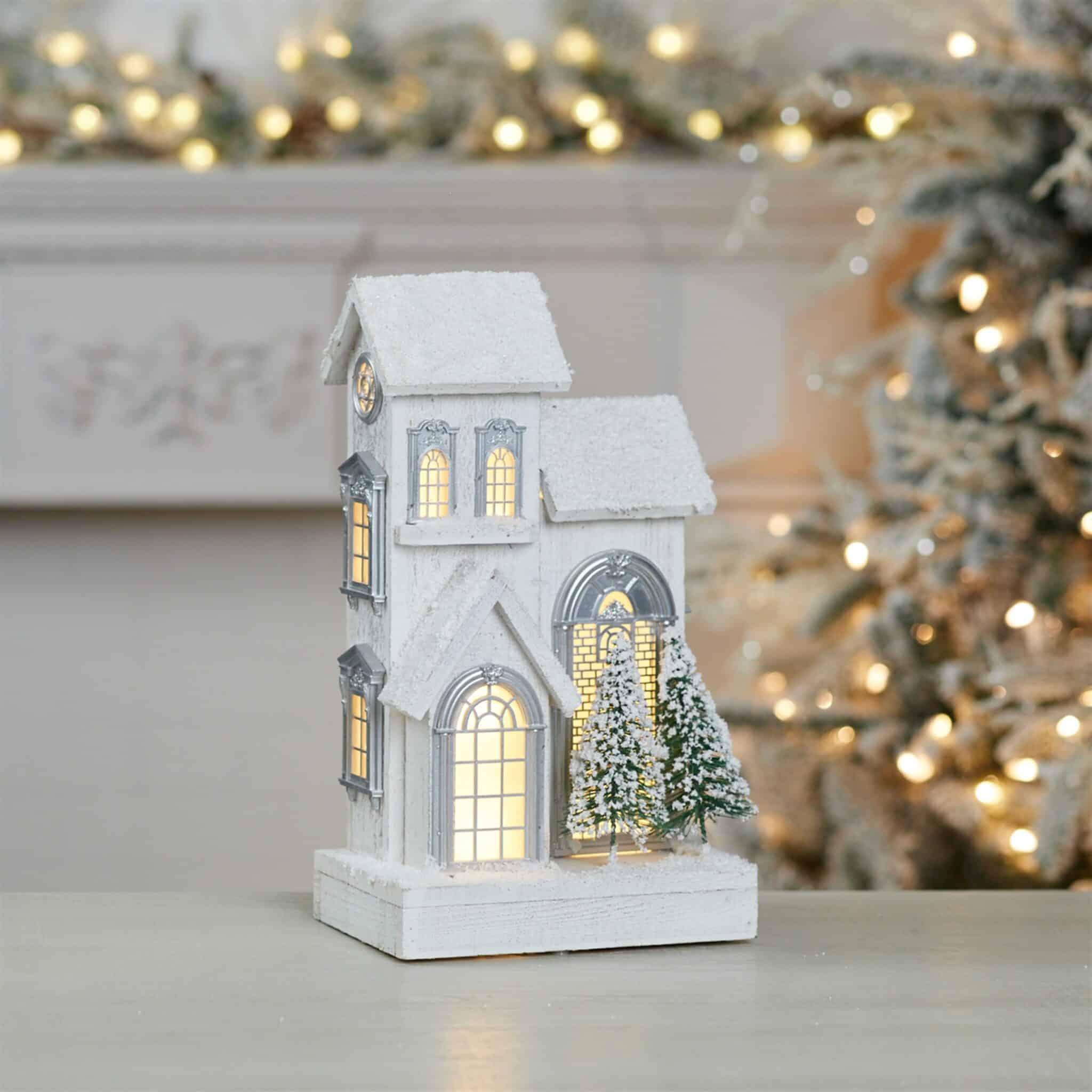 Bring the quiet beauty of a snowy winter evening into your home with the Winterglow Manor LED Wooden House. This elegant decorative piece blends traditional holiday charm with a serene palette of wintry white and silver. Featuring a classic wooden structure with gracefully arched windows and flocked pine tree accents, this house captures the cozy spirit of the season.