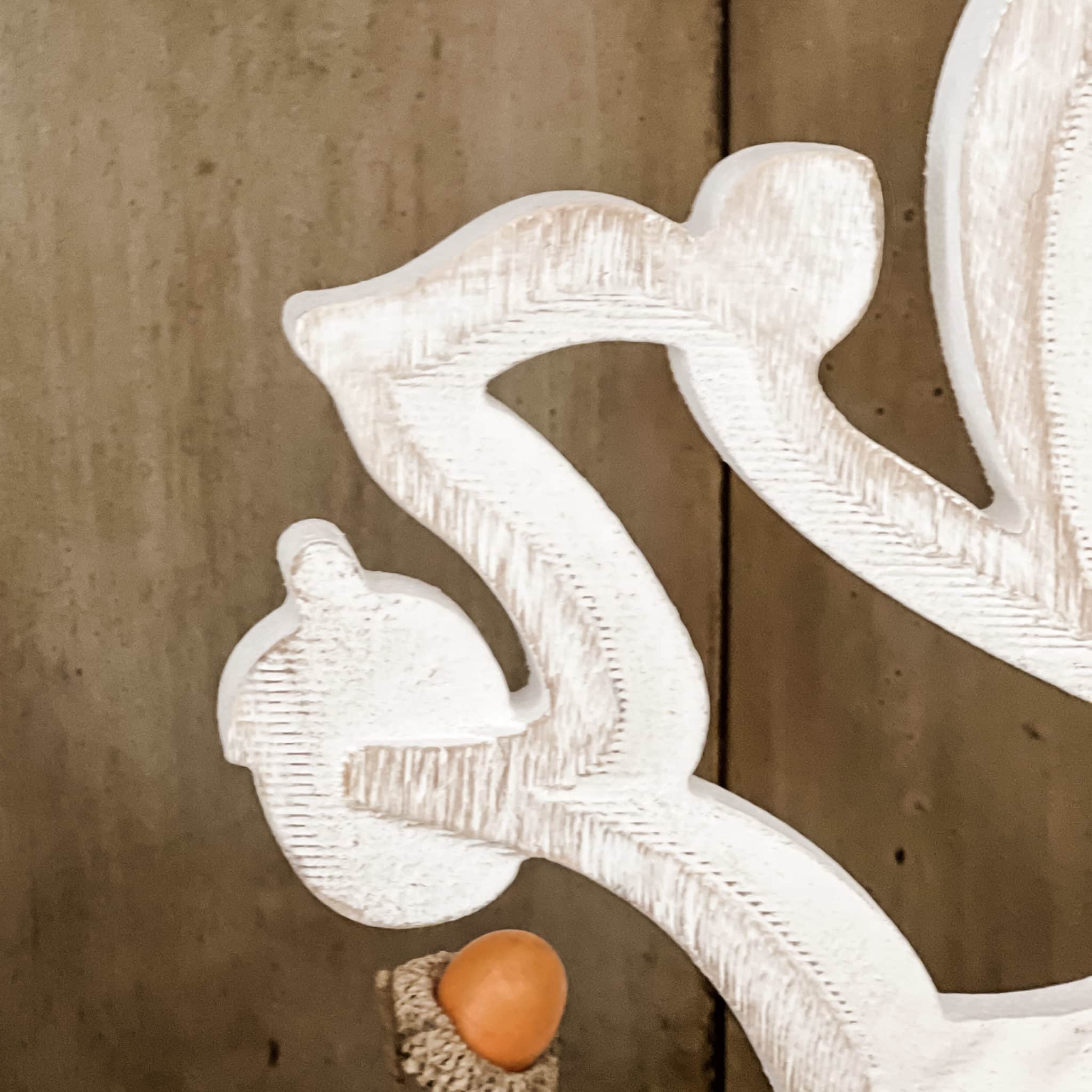 Sweetly stylized, the Wood Squirrel Cut Out brings a delightfully fresh look to your harvest home this season. Constructed of wood, this darling figure holds tight to an acorn, finished in easy-going soft whites over raw wood tones that blend easily into any decorating style. The graceful curves and cut-out design offer visual interest and a lightweight feel that is current and contemporary. The squirrel is secured to a wooden base, allowing for easy tabletop display.