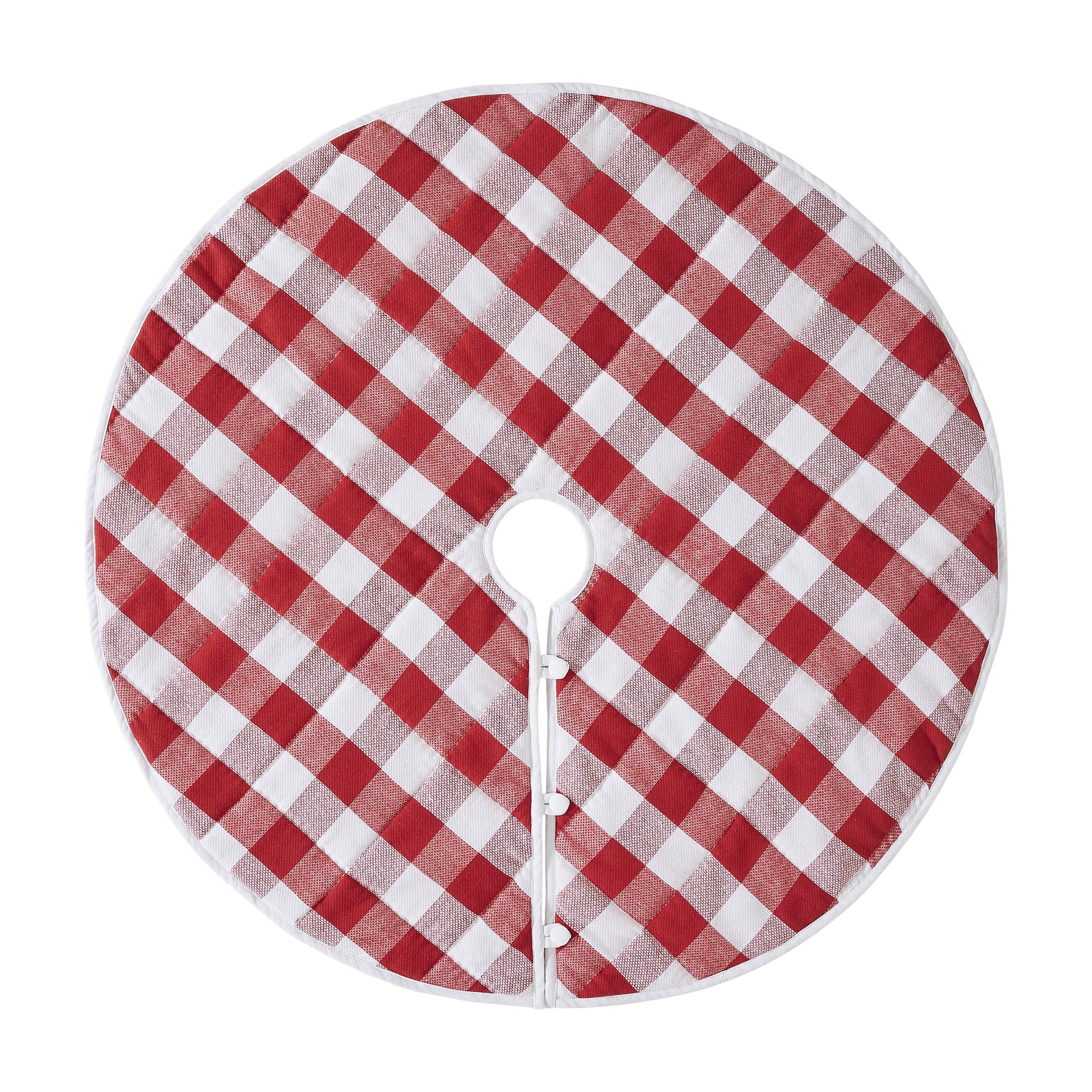 Add modern farmhouse charm to your holiday traditions with the Annie Red Check Tree Skirt. Measuring 48 inches in diameter, this round tree skirt showcases a crisp white base accented with bold red stripes arranged in a classic buffalo check pattern. The timeless plaid design adds a cozy yet sophisticated touch, perfectly suited for farmhouse, cottage, or modern holiday decor. Crafted with a cotton-polyester blend and finished with diamond quilting, this durable tree skirt is designed for yearly use, offering both softness and structure to complement your Christmas tree with ease.
